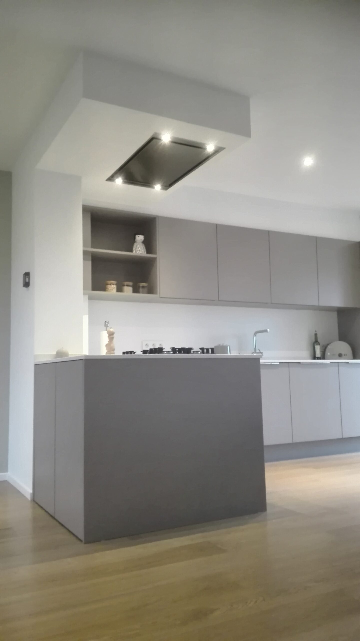 Le retour îlot avec la zone cuisson permet d’avoir un visuel sur le séjour. La hotte Novy est quand à elle intégrée dans le faux plafond en mdf.